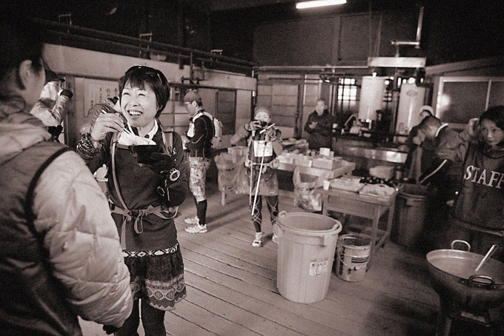 The weather for the race was perfectly clear, with blue skies, but cold. 193 participants for the 36-kilometer “Dragon Climb Race” ran up Shichimen to the Keishin-in midpoint. The foyer of the temple was transformed into a warming up station serving hot azuki bean soup with rice flour dumplings in it. A tiny slice of paradise along the cold, hard way.